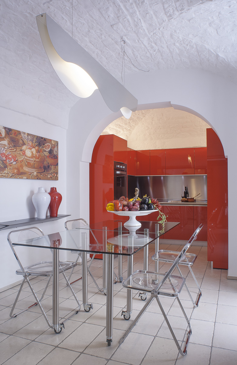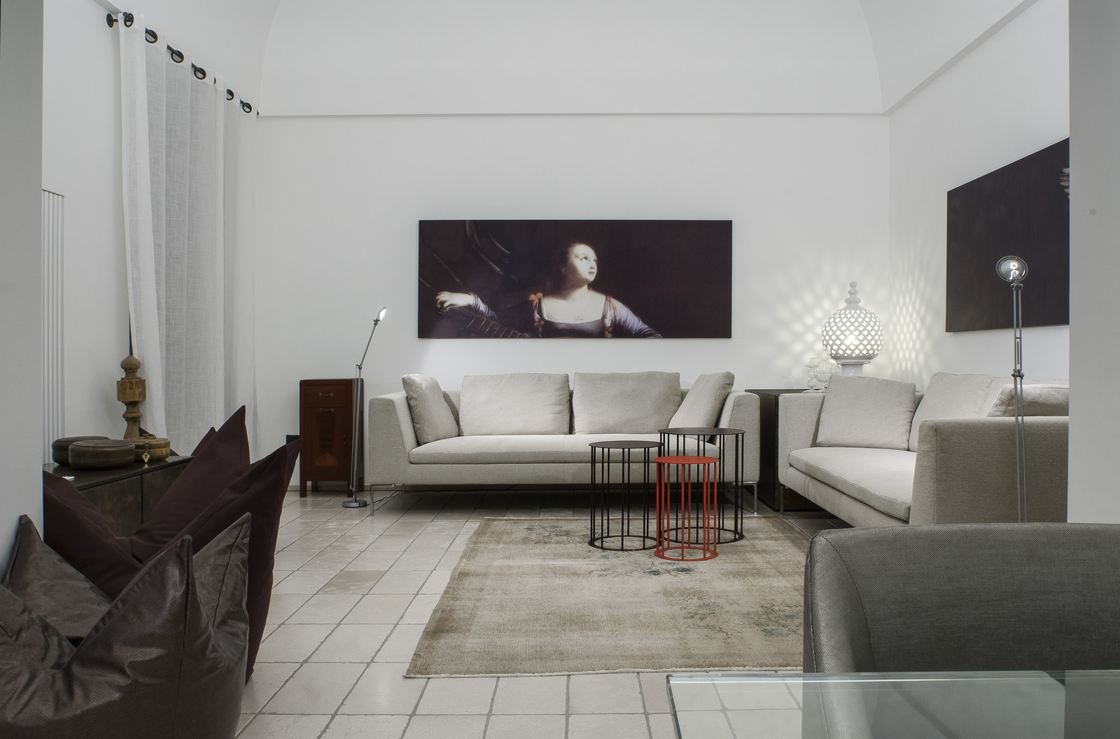 In this antique private house, located in the old town of Ostuni, Puglia, the Beige limestone floor covering, used with a regular unique size pattern, perfectly fits with the contemporary interior design.